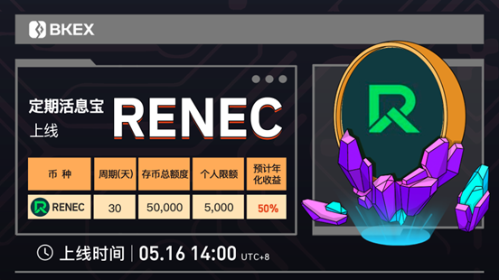 与此同时,BKEX 也将在定期活息宝上线 RENEC,周期为 30 天,预计年化收益为 50%。BKEX 定期活息宝是一种币本位定期理财,旨在存币生息。期限越长,收益越高,支持提前赎回,随存随取。