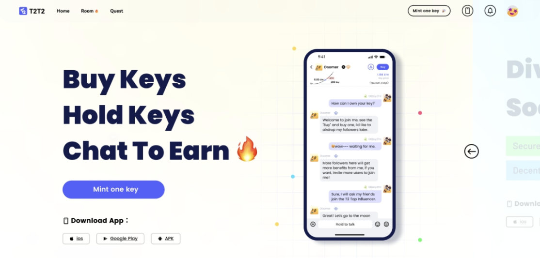 T2T2 平台即将在 Trading Room 功能正式上线后启动第二期 $T-Points 赚取规则,这一规则的设计将为我们的用户提供更多赚取积分的机会。Trading Room 作为我们平台的明星产品,在用户获取 $T-Points 的过程中发挥了重要作用。具体而言,普通用户可以通过买卖 Key 来获得积分,而 Trading Room 的房主则每日根据资产快照结果获得分红。此外,房主和用户还可以通过配置 $T2T2 来获取积分。有关详细信息,请参考我们的相关文章。